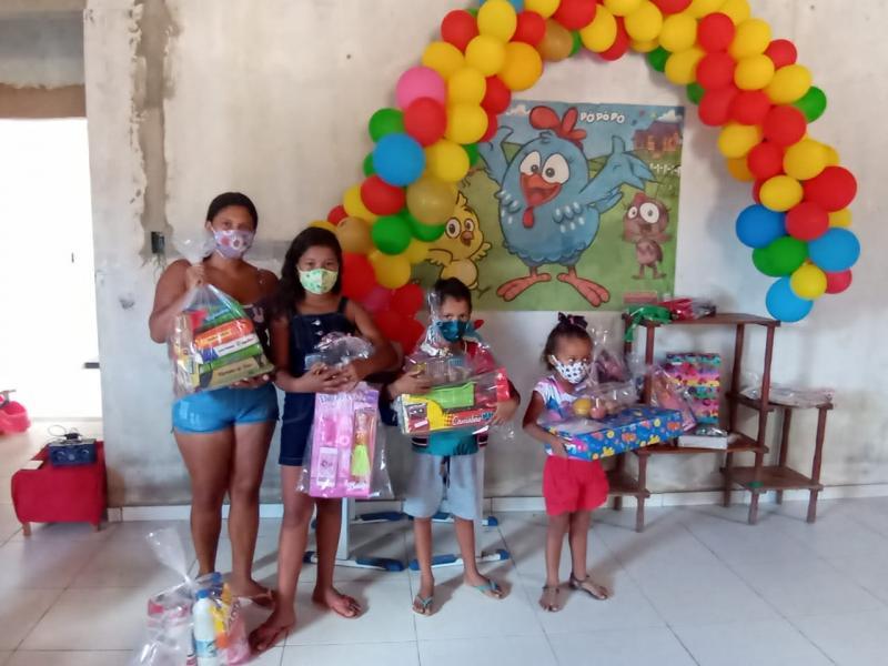 No mesmo dia também foi comemorado o Dia das Crianças do Projeto Grão de Areia no bairro Pirâmide. Na ocasião, foram entregues cestas básicas e kits de higiene para as famílias e não poderia faltar os brinquedos tão esperado pelas crianças. Devido a pandemia foram servidos lanches, pipocas e bombons as criancinhas, mas que tiveram que levar para suas casas.