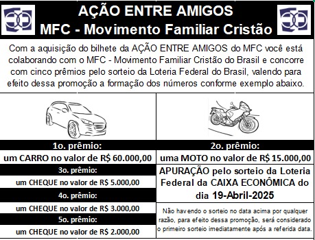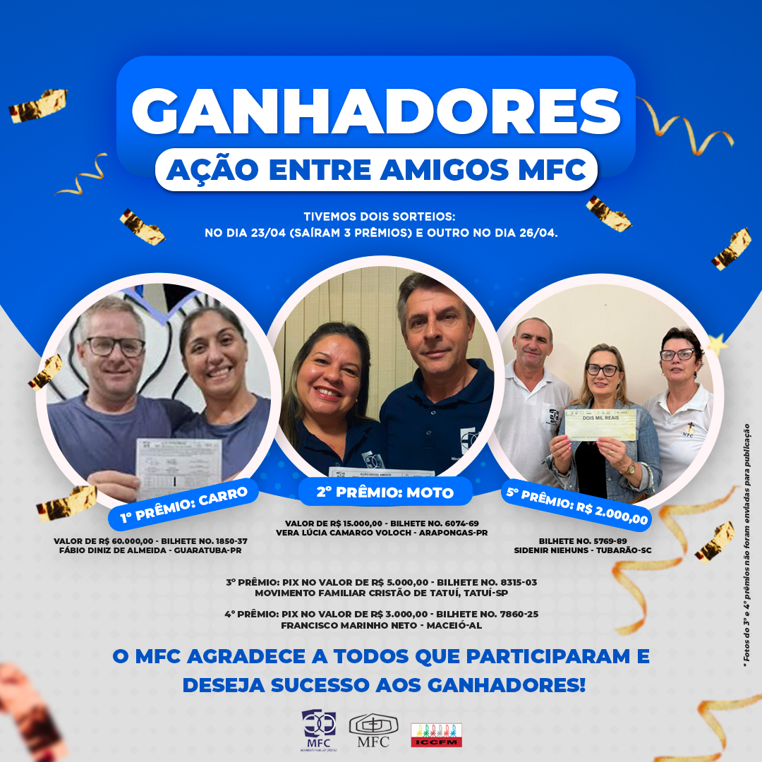 Confira os vencedores dos 5 prêmios da Ação entre Amigos MFC. O MFC agradece a todos que participaram e colaboraram com o nosso Movimento e deseja sucesso aos ganhadores!