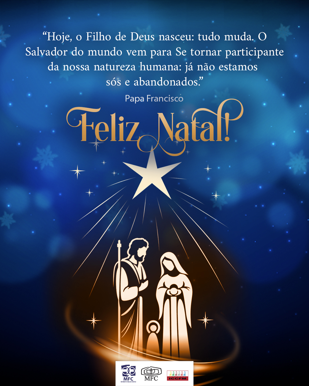 Blog Atuação MFC Condin Ínicio2025dezembroBlog Atuação MFCFeliz Natal! Feliz Natal! por MFC Nacional dezembro 23, 2025 7 Visualizações Compartilhar “Hoje, o Filho de Deus nasceu: tudo muda. O Salvador do mundo vem para Se tornar participante da nossa natureza humana: já não estamos sós e abandonados.” Papa Francisco. O MFC Brasil deseja a todos um Feliz Natal!