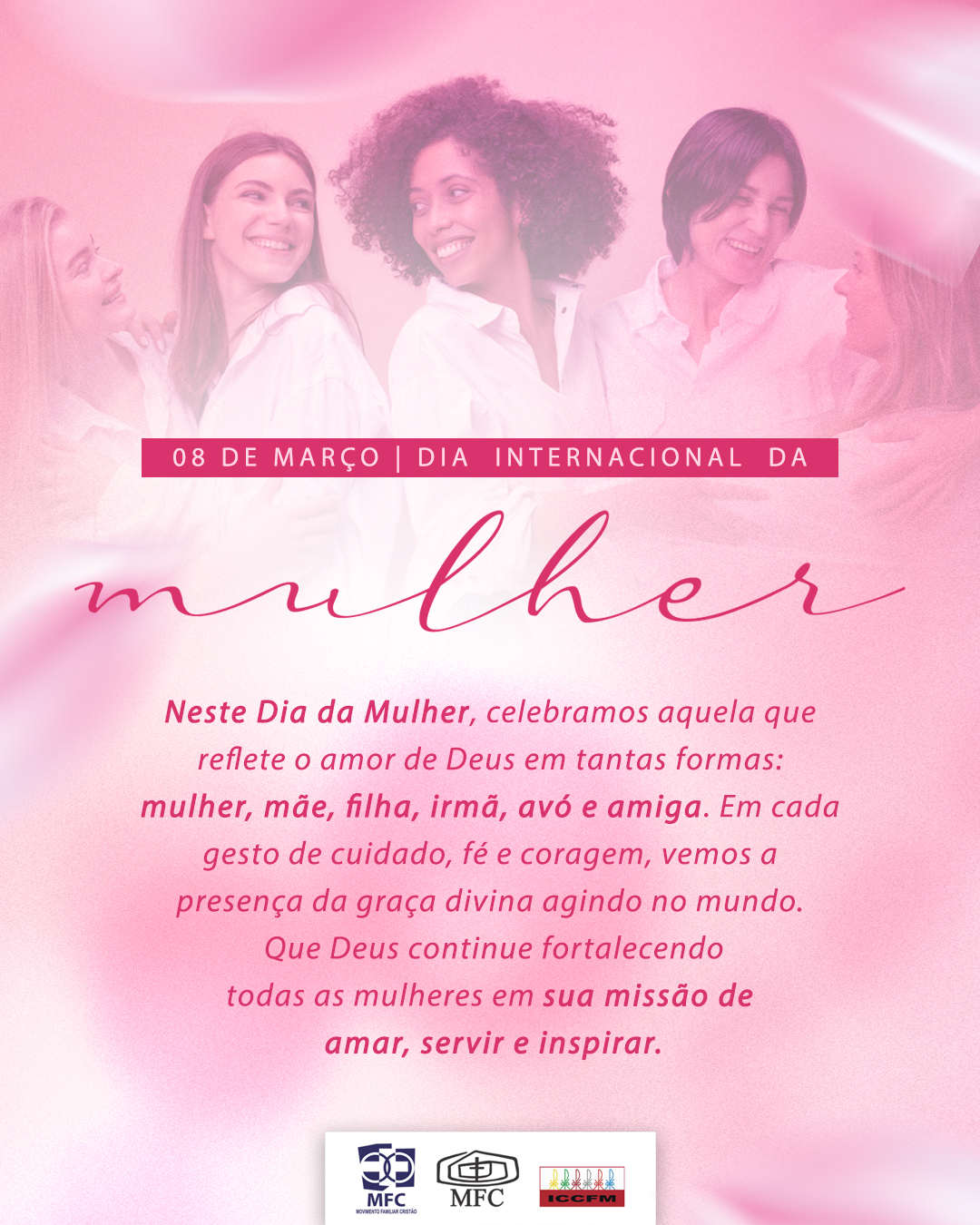 Neste Dia da Mulher, celebramos aquela que reflete o amor de Deus em tantas formas: mulher, mãe, filha, irmã, avó e amiga. Em cada gesto de cuidado, fé e coragem, vemos a presença da graça divina agindo no mundo. Que Deus continue fortalecendo todas as mulheres em sua missão de amar, servir e inspirar.